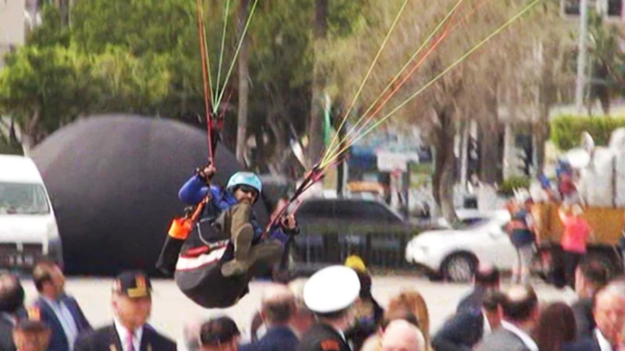 Kontrolünü kaybeden paraşütçü, törendeki protokolün üzerine indi. Kazada yaralanan olmazken, çevredekilerin de yardımıyla paraşüt toparlandı.