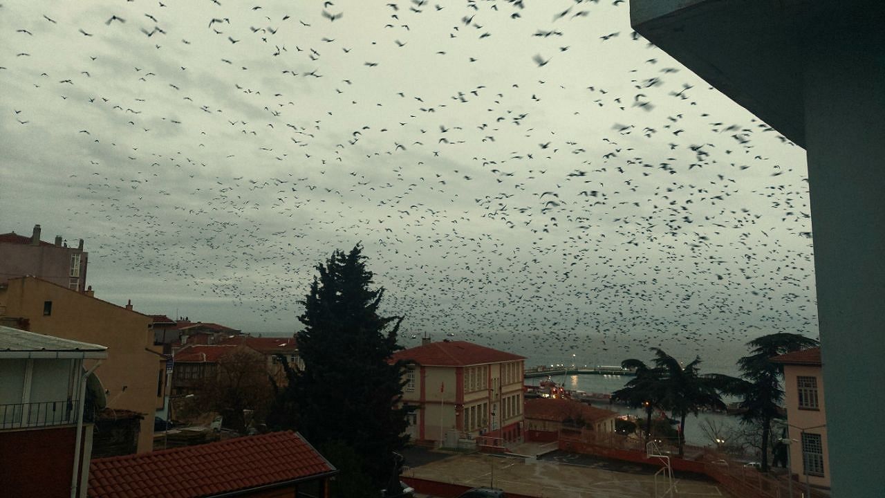 Gökyüzünde karga sürüsünü gören vatandaşlar da hayretler içerisinde kaldı. Akşam karanlığının çökmeye başladığı saatlerde, gökyüzünü bir anda istila eden yüzlerce kargalar Hitchcock'un 'Kuşlar' filmini akıllara getirdi. İHA