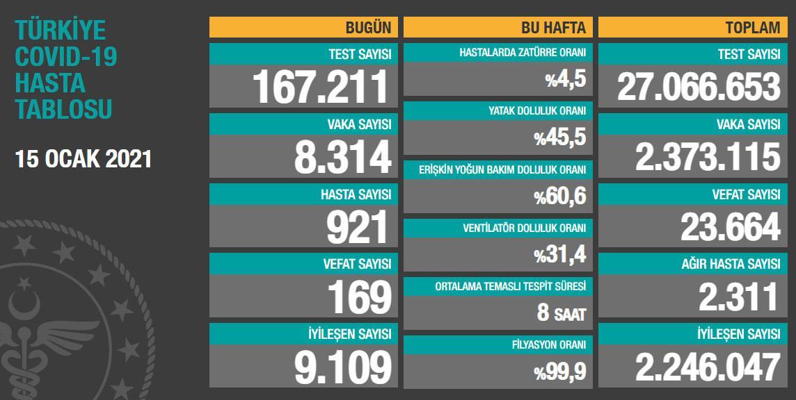 Sağlık Bakanlığı, 15 Ocak Türkiye Günlük Korona Tablosu'nu paylaştı.