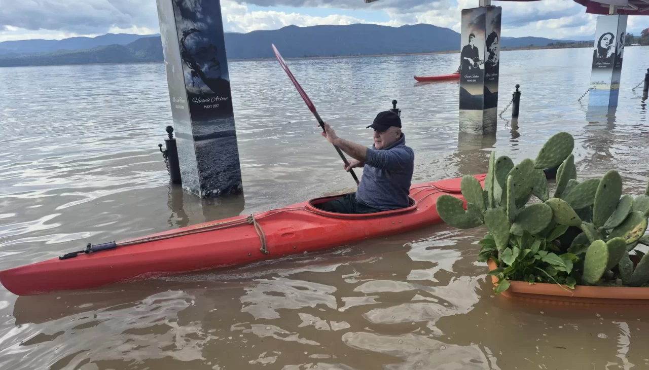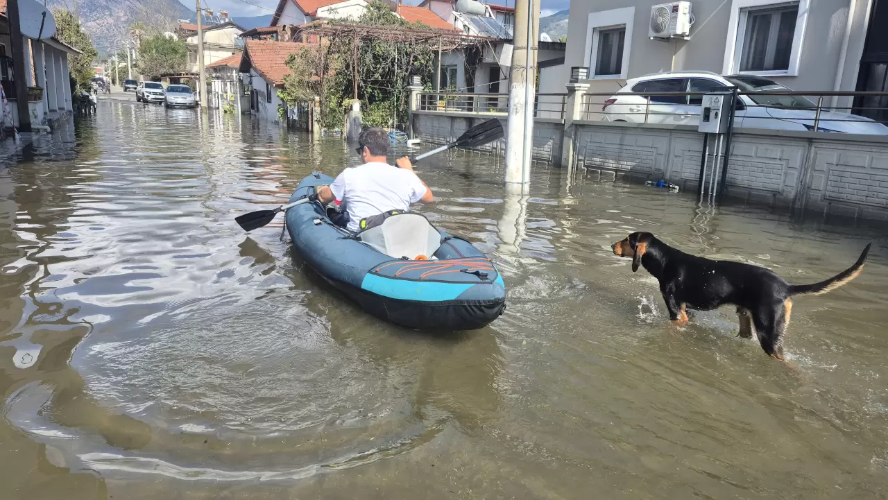 Muğla'da bazı vatandaşlar, Köyceğiz Gölü'nün yükselmesi sonucu su altında kalan cadde ve sokaklarda kanolarla gezdi.