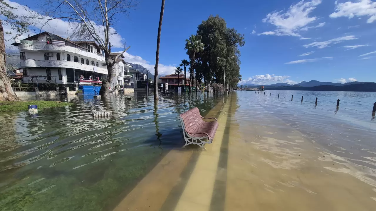 Öte yandan Köyceğiz Gölü'nde oluşan taşkın, su altında kalan işletmeler ve plajlar da dronla görüntülendi.