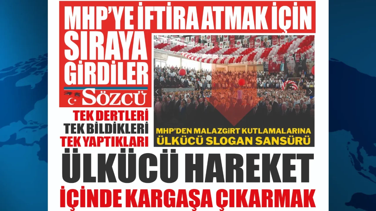 Bugüne kadar ülkücü hareket yararına hiç bir haber vermeyen gazete, MHP Genel Başkan Yardımcısı Semih Yalçın'ın açıklamalarını hedefinden saptırarak parti için tabana subliminal mesaj vermeye kalkıştı! Semih Yalçın imzasıyla, Malazgirt Zaferi’nin 954. yıl dönümü dolayısıyla parti teşkilatlarına gönderilen genelgede yazanları bağlamından çıkararak, “MHP'den Malazgirt kutlamalarına ülkücü slogan sansürü” başlığı atan Sözcü gazetesi, tek görevinin ortalığı karıştırmak olduğunu gösterdi.