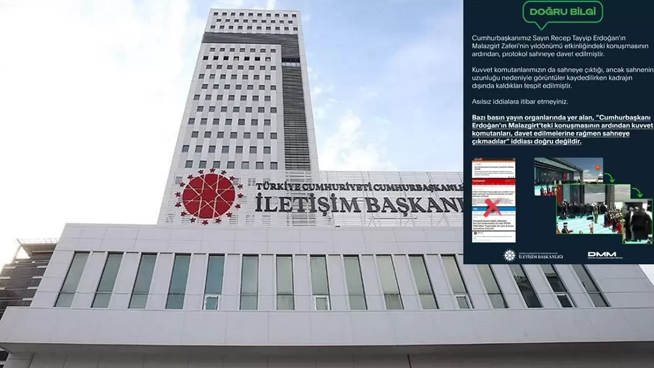 “Bazı basın yayın organlarında yer alan, “Cumhurbaşkanı Erdoğan'ın Malazgirt’teki konuşmasının ardından kuvvet komutanları, davet edilmelerine rağmen sahneye çıkmadılar” iddiası doğru değildir. Cumhurbaşkanımız Sayın Recep Tayyip Erdoğan'ın Malazgirt Zaferi'nin yıldönümü etkinliğindeki konuşmasının ardından, protokol sahneye davet edilmiştir. Kuvvet komutanlarımızın da sahneye çıktığı, ancak sahnenin uzunluğu nedeniyle görüntüler kaydedilirken kadrajın dışında kaldıkları tespit edilmiştir. Asılsız iddialara itibar etmeyiniz.”