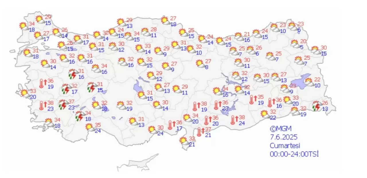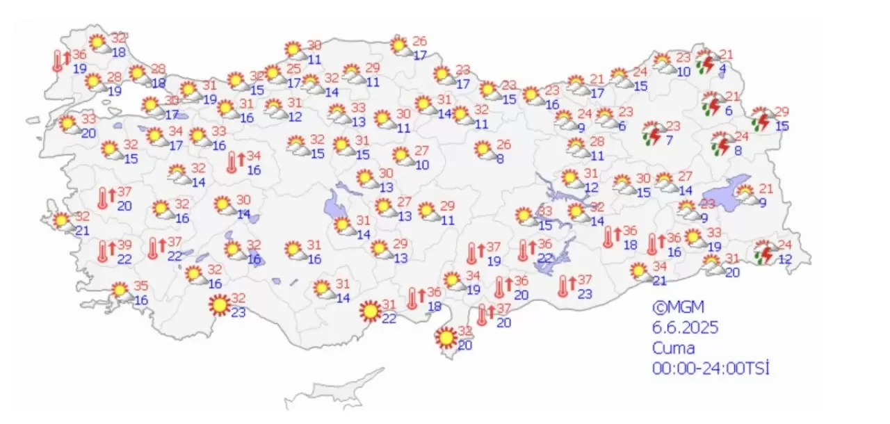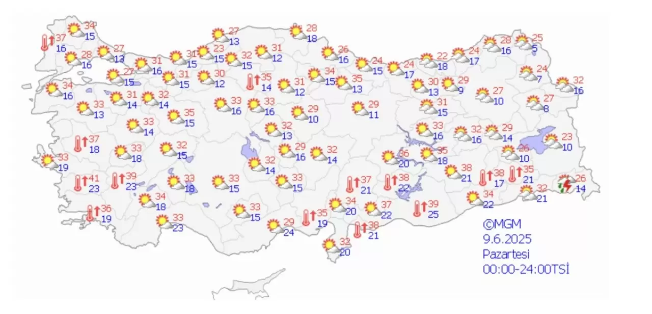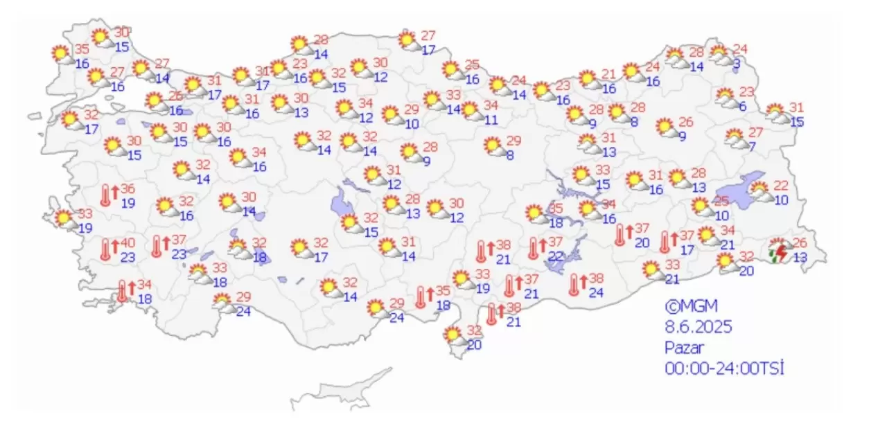 Güneydoğu Anadolu’da gündüz sıcaklıkları 40 dereceye kadar yükseliyor. Marmara, Ege, İç Anadolu ve Güneydoğu Anadolu bölgelerinde ise sıcaklıklar 30 ila 35 derece arasında olacak.