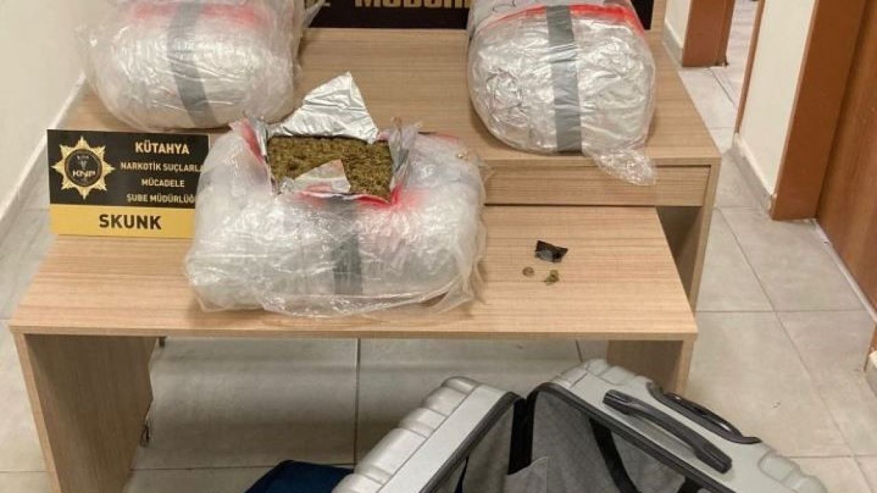 Kütahya İl Emniyet İstihbarat ve Narkotik Suçlarla Mücadele Şube Müdürlüğünce yapılan çalışmalar sonucu gece saatlerinde şüphe üzerine durdurulmak istenen araç, dur ihtarına uymayarak kaçmaya başladı. Yapılan kovalamaca sonucu araç ve yaya olarak kaçmaya çalışan H.C. ve A.U. isimli şahıslar yakalanırken, otomobilde yapılan aramada 2 farklı valize gizlenmiş 3 parça halinde toplam 17 kilo 122 gram skunk ele geçirildi