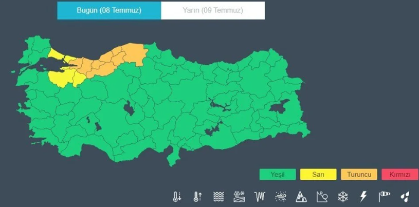 Öte yandan İstanbul, Bursa, Bilecik ve Yalova için sarı kodlu uyarı verilirken Bolu, Kocaeli, Zonguldak, Düzce, Kastamonu, Sakarya, Bartın ve Karabük için ise turuncu kodlu uyarı verildi.