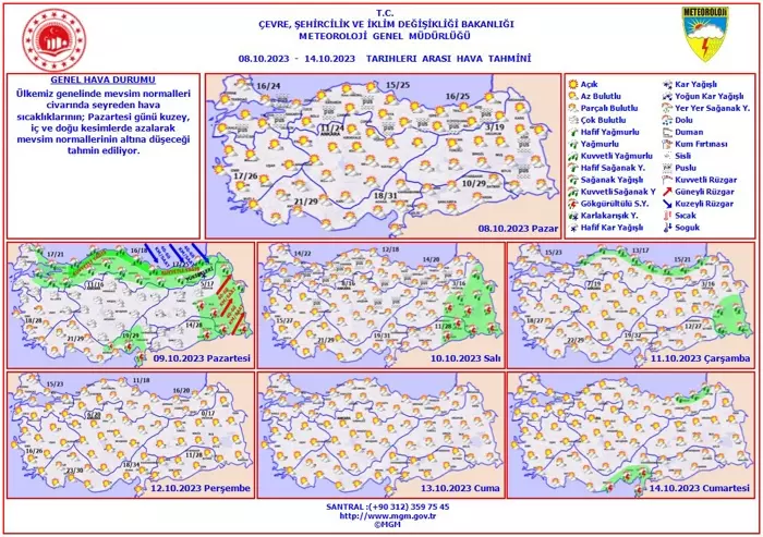 Meteoroloji Genel Müdürlüğü tarafından yapılan son değerlendirmelere göre; ülkemiz genelinin parçalı bulutlu, gece saatlerinden itibaren İstanbul'un kuzey kıyıları, Kırklareli kıyıları, Kocaeli, Sakarya, Düzce, Zonguldak, Bartın, Sinop ve Osmaniye çevreleri ile Hatay kıyılarının sağanak ve gök gürültülü sağanak yağışlı geçeceği tahmin ediliyor. Sabah ve gece saatlerinde Marmara ve Karadeniz'in iç kesimleri ile Doğu Anadolu'nun doğusunda yer yer pus bekleniyor.