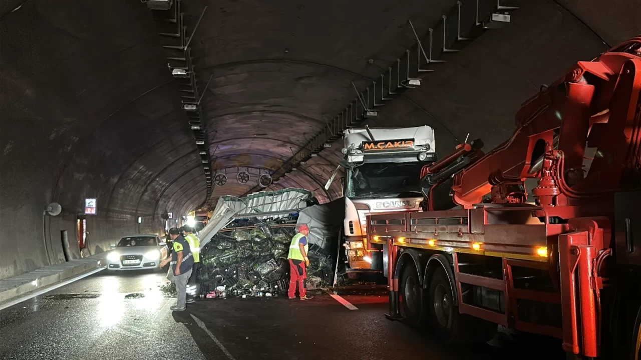 Kuzey Marmara Otoyolu Riva Tüneli içerisinde seyir halindeki tır, lastiğinin patlatması sonucu devrildi. Sebze kasaları yola savrulurken, kapanan yolda kilometrelerce araç kuyruğu oluştu.