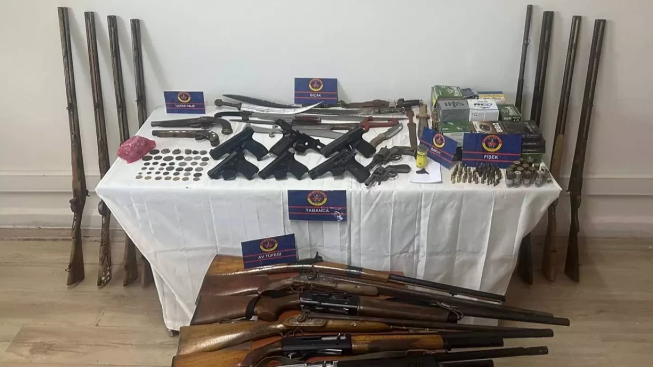 Evde yapılan aramada 2'si tarihi eser niteliğinde 10 tabanca ve 130 fişek, 14 ruhsatsız av tüfeği, 145 sikke ile 13 kesici ve delici alet ele geçirildi.