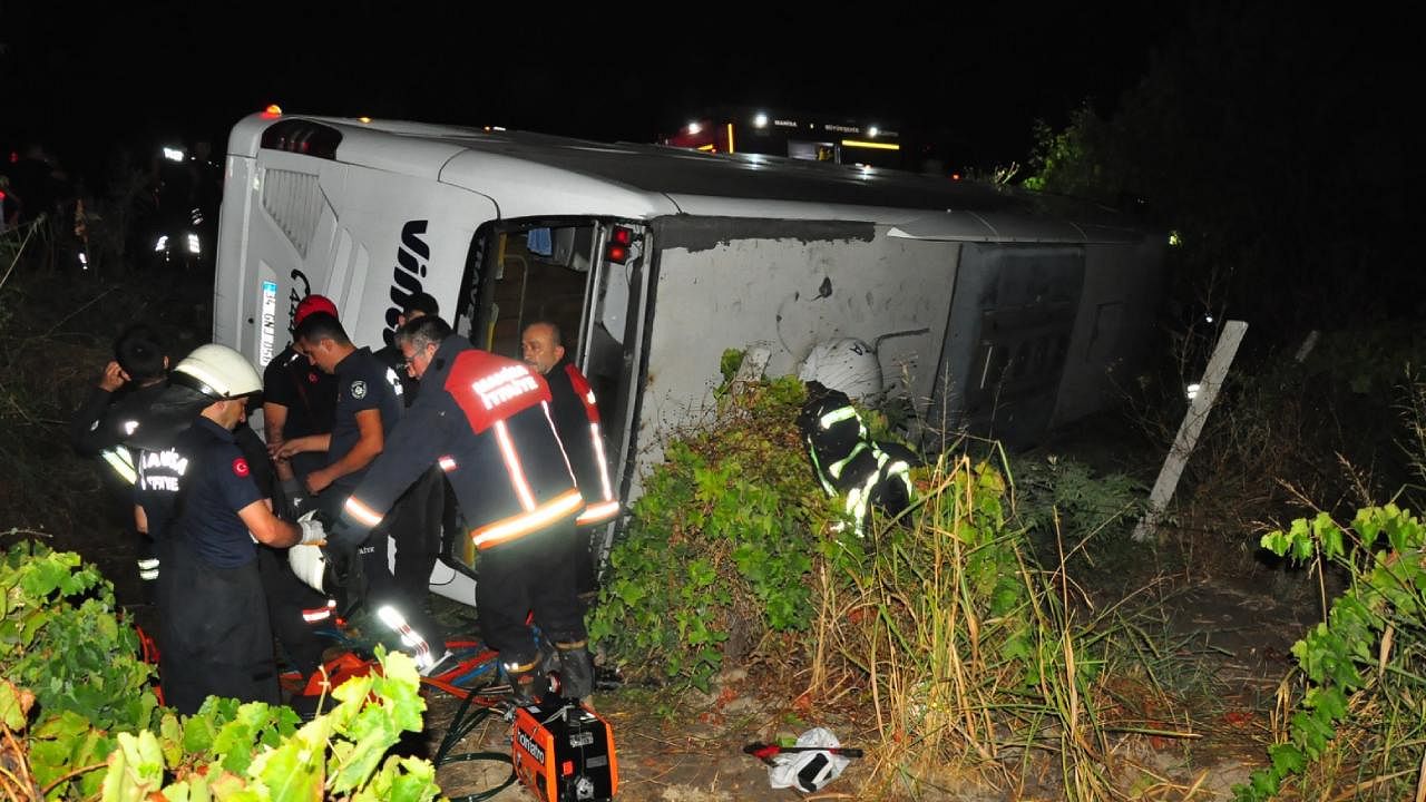 Otobüs devrilirken 4’ü personel 29 kişinin bulunduğu otobüste 15 yolcu yaralandı. İhbar üzerine bölgeye sağlık, itfaiye ve polis ekipleri sevk edildi.