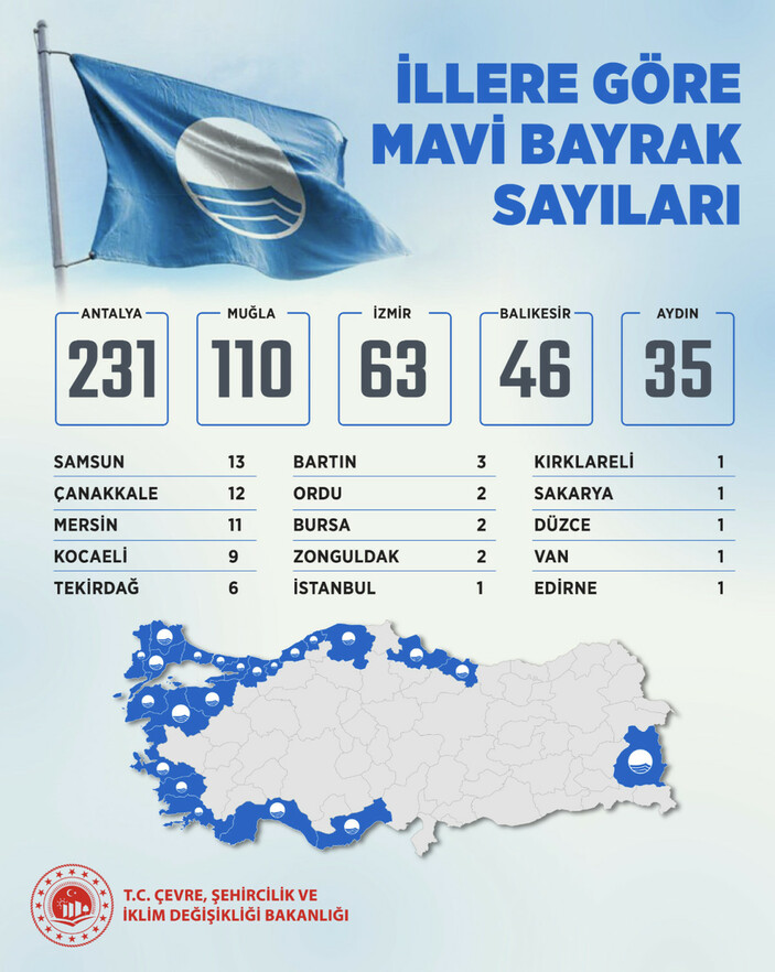 Türkiye genelinde Antalya'da 231, Muğla'da 110, İzmir'de 63, Balıkesir'de 46, Aydın'da ise 35 mavi bayraklı plaj bulunduğu ifade edildi. Ayrıca Samsun'da 13, Çanakkale'de 12, Mersin'de 11, Kocaeli'de 9, Tekirdağ'da 6, Bartın'da 3, Ordu, Bursa ve Zonguldak'ta 2'şer, İstanbul, Kırklareli, Sakarya, Düzce, Van ve Edirne'de ise 1'er mavi bayraklı plaj olduğu kaydedildi.