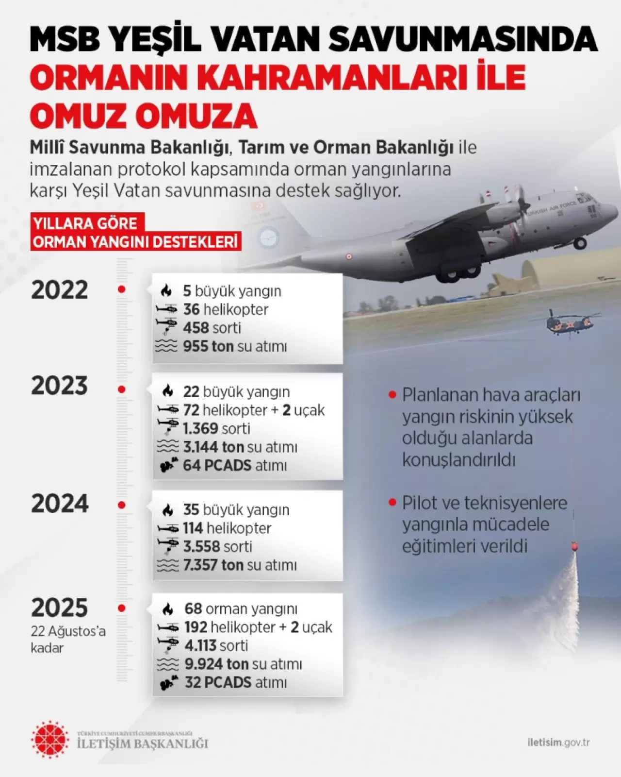 İletişim Başkanlığı'nın sosyal medya hesabından yayımlanan infografiğe göre, MSB'nin desteğiyle son dört yılda yüzlerce orman yangınına müdahale edildi. Bu destek, özellikle büyük yangınlarda kritik rol oynadı.