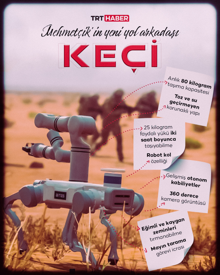 Keçi’nin su ve çamurun içinde rahatlıkla yol alabildiğini belirtiyor Coşkun ve “Karşılaştığı kimi diğer coğrafi engelleri de aşabilecek bir üründen bahsediyoruz. Otonom bir robot köpek olarak tanımladığımız Keçi’yi sahadaki güvenlik güçlerimizle beraber çalışabilecek bir hale getireceğiz. Keçi, askerimizin bir nevi ‘kol arkadaşı’ olacak” diyor.
