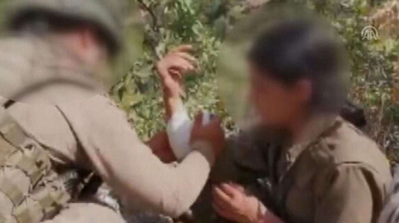 Görüntülere göre komandolar, çatışma sonrası arama-tarama faaliyetleri sırasında çalılıkların arasında kadın teröristin saklandığını tespit etti.