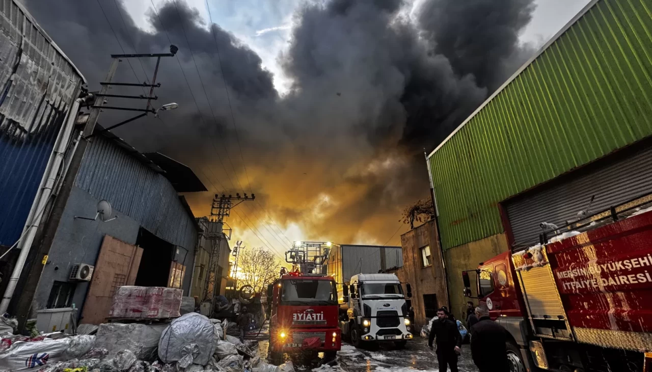 Mersin'in Toroslar ilçesinde geri dönüşüm fabrikasının deposunda çıkan yangına müdahale ediliyor.