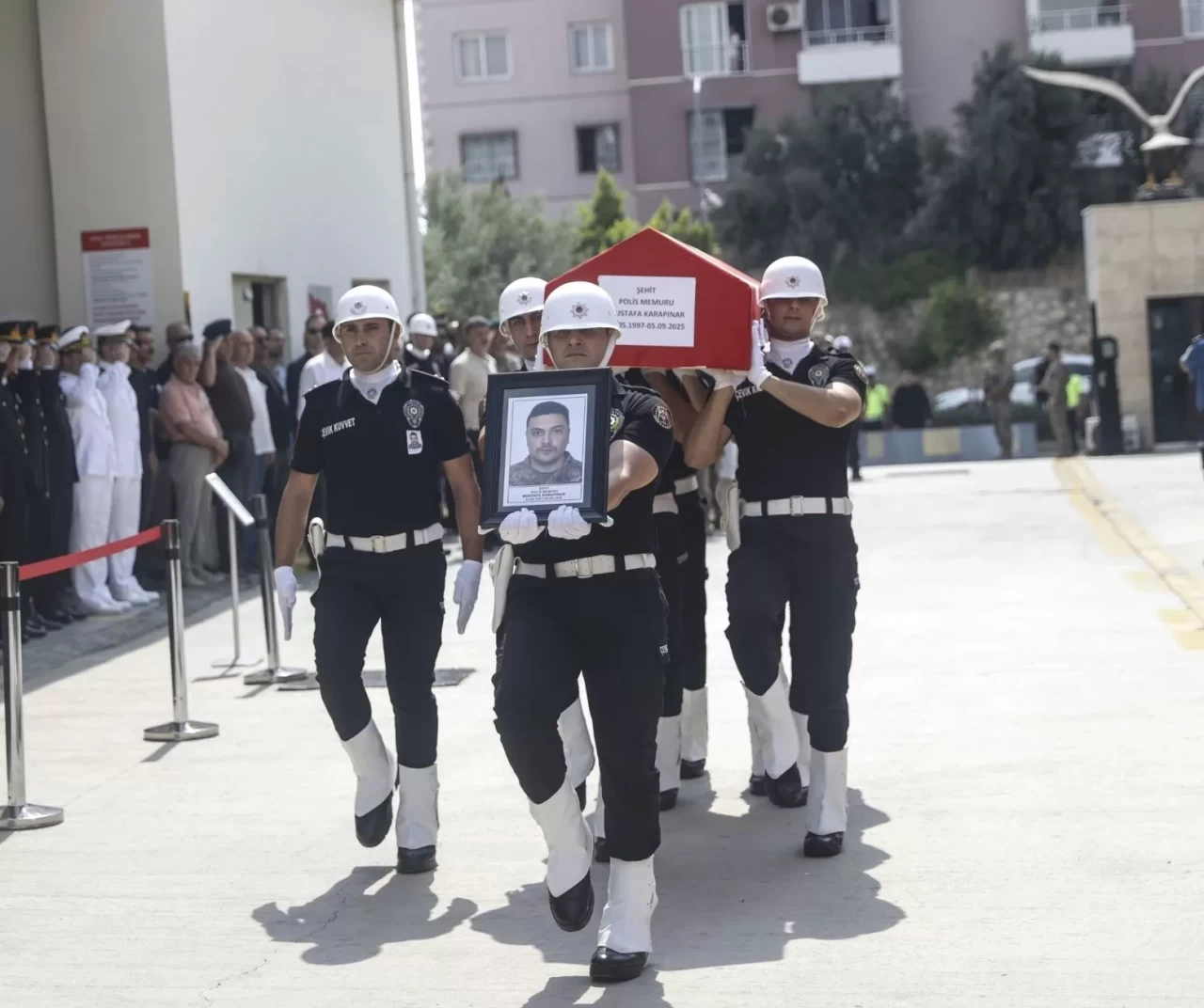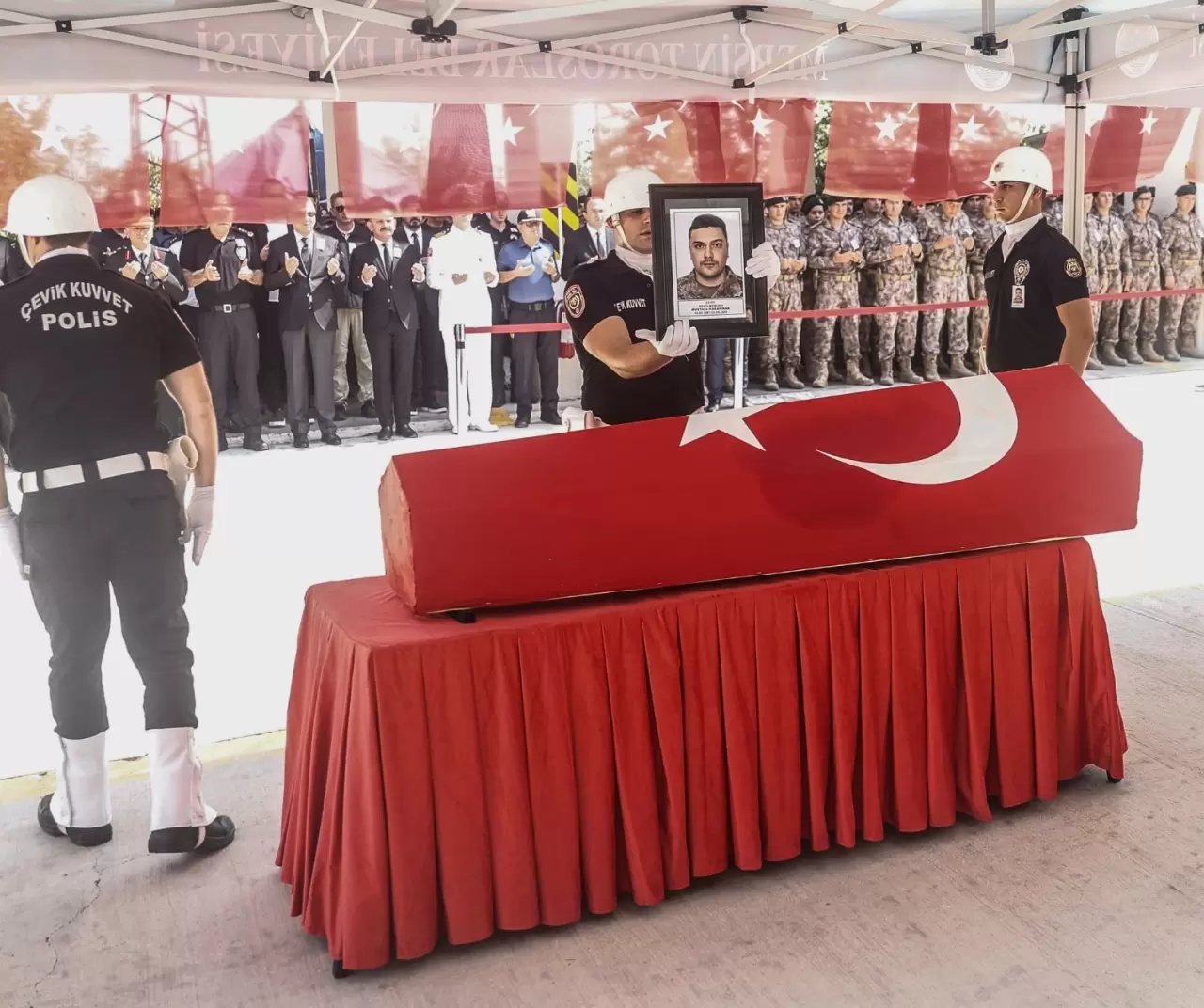 28 yaşındaki şehit Karapınar'ın Türk bayrağına sarılı naaşı Mersin İl Emniyet Müdürlüğü Özel Harekat Şube Müdürlüğü binasına getirildi.