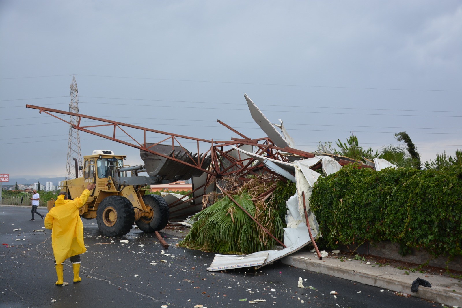 Tarsus İlçe Emniyet Müdürlüğü Polis Merkezi ve Çocuk Büro Amirliğinin bulunduğu Kızılmurat Mahallesi'ndeki hizmet binasının çatısındaki demir tente, fırtınanın etkisiyle bahçe demirliklerinin üzerine düştü.
