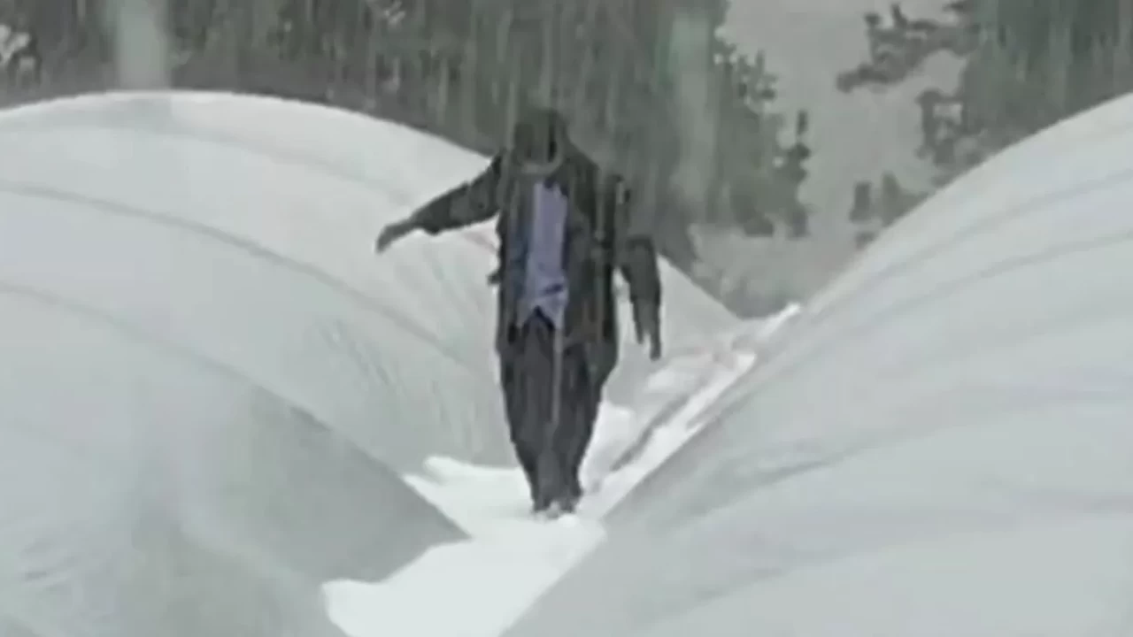 Bir çiftçinin, serasının üzerindeki dolu birikintisini kürekle temizlemeye çalıştığı anlar cep telefonu kamerasına yansıdı.