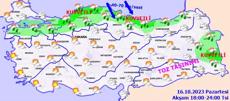 Bugün Marmara'da rüzgar kuzey yönlerden fırtına hızında esecek. Çatı uçmalarına ve ağaç devrilmelerine dikkat edin. Doğu Anadolu'da yüzeysel toz taşınımı var yağmur çamur şeklinde olabilir. Önümüzdeki 4 gün sıcaklıklar düşüyor cumadan itibaren tekrar yükseliyor."