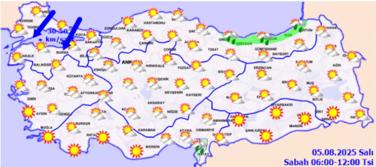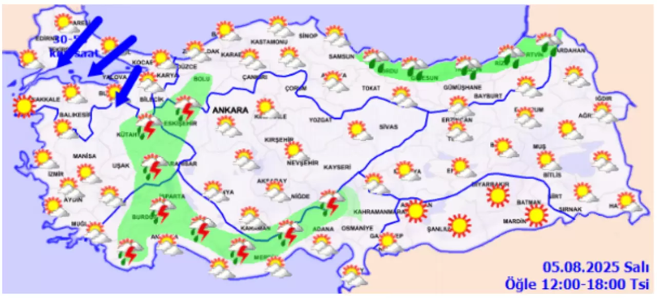 Meteoroloji Genel Müdürlüğü'nün yayımladığı uyarı haritasına göre, yurdun kuzey ve iç kesimleri ile Akdeniz’in parçalı yer yer çok bulutlu, Akdeniz’in iç kesimleri, Doğu Karadeniz kıyıları, Denizli, Kütahya, Afyonkarahisar, Eskişehir, Bolu ve Ordu çevrelerinin yerel sağanak ve gök gürültülü sağanak, diğer yerlerin az bulutlu ve açık geçeceği tahmin ediliyor