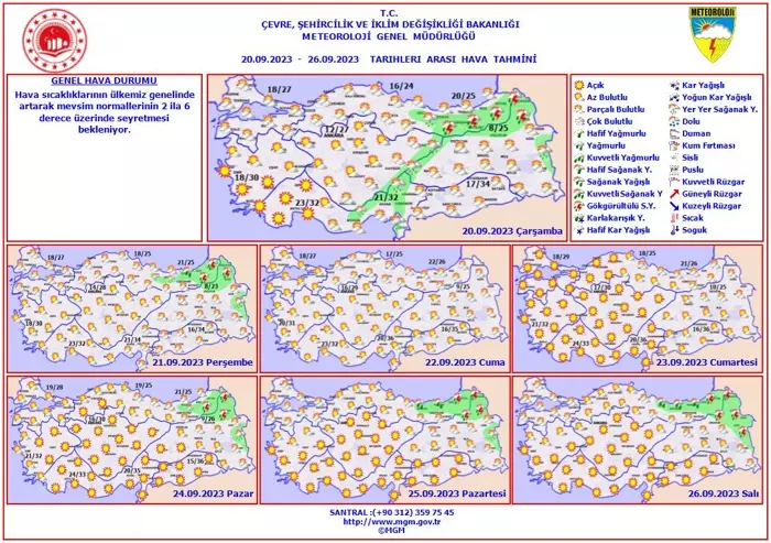Meteoroloji 20 Eylül Çarşamba güncel hava durumu raporunu yayımladı. Yeni rapora göre yurt genelinde sıcak hava etkili olacak. Ancak 7 il için sağanak uyarısı var. Yağışlar öğle saatlerinde sonra etkili olacak. İşte il il hava durumu
