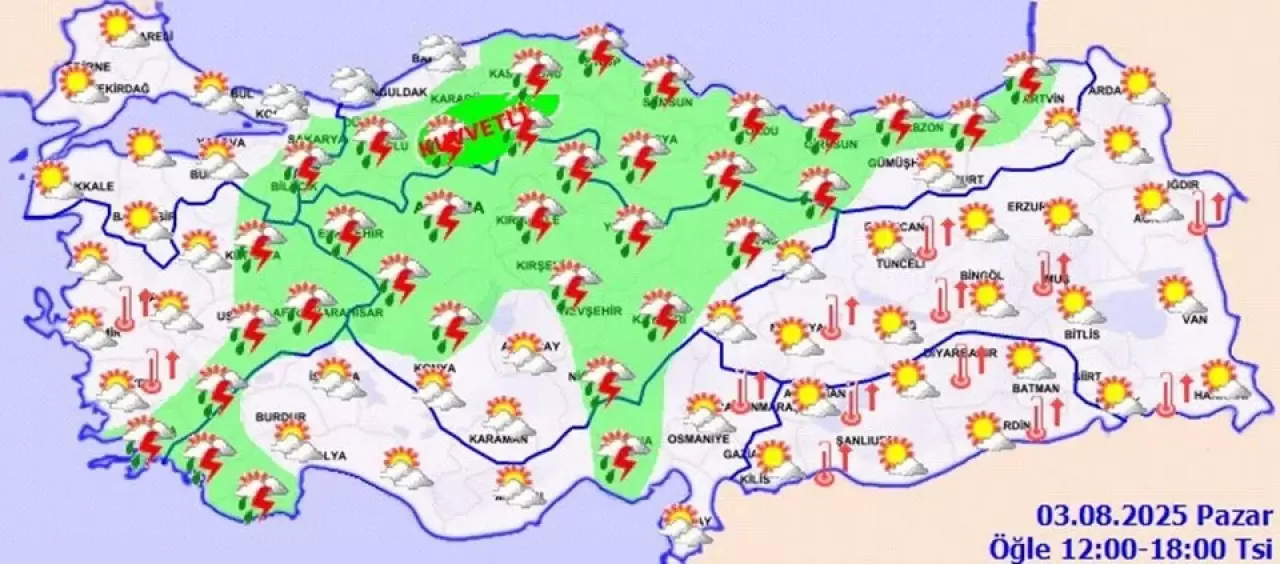 Buna göre Balıkesir, Sakarya, Afyonkarahisar, Uşak, Denizli, Muğla, Adana, Antalya, Ankara, Eskişehir, Konya, Nevşehir, Kırşehir, Kırıkkale, Bolu, Düzce, Sinop, Zonguldak, Amasya, Tokat, Artvin, Samsun, Trabzon, Rize, Giresun, Kocaeli, Bilecik, Kütahya, Karabük ve Çankırı'da sağanak yağış görülecek.
