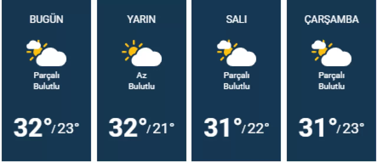 Meteoroloji Genel Müdürlüğü'nden alınan bilgilere göre İstanbul için 5 günlük hava durumu tahmini: Bugün için İstanbul hava durumu Parçalı Bulutlu, sıcaklık 32°. Yarın için İstanbul hava durumu Az Bulutlu, sıcaklık 32°. 5 Ağustos 2025 Salı İstanbul hava durumu Parçalı Bulutlu, sıcaklık 31°. 6 Ağustos 2025 Çarşamba İstanbul hava durumu Parçalı Bulutlu, sıcaklık 31°.