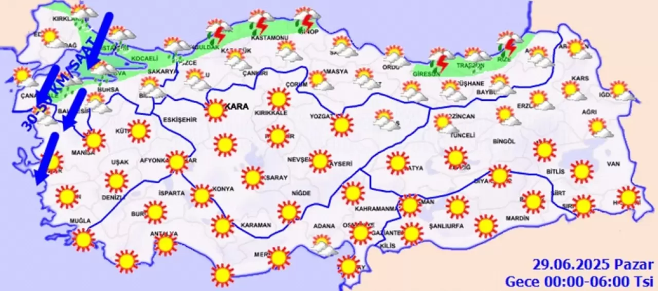 Yapılan tahminlere göre, yurdun kuzey kesimlerinin parçalı yer yer çok bulutlu, Marmara'nın kuzeyi, Batı ve Doğu Karadeniz kıyıları ile Ordu çevreleri ve Balıkesir'in kuzeyinin yerel olmak üzere sağanak ve gök gürültülü sağanak yağışlı, diğer yerlerin az bulutlu ve açık geçeceği tahmin ediliyor.