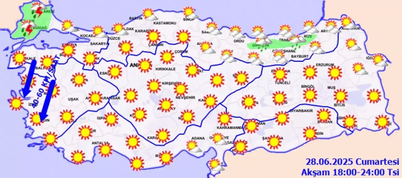 Rüzgarın, Marmara’nın güneyi ile Kuzey ve Kıyı Ege’de kuvvetli ve kısa süreli fırtına (40-70 km/saat) şeklinde esmesi beklendiğinden yaşanabilecek olumsuzluklara karşı dikkatli ve tedbirli olunması gerekmektedir.