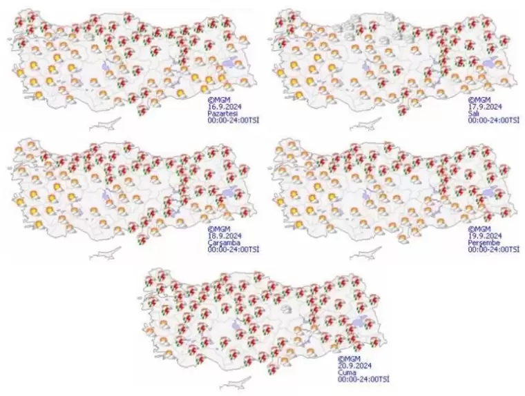 Meteoroloji Genel Müdürlüğü tarafından yapılan son tahminlere göre: Ülkenin kuzey ve iç kesimleri ile Akdeniz'in iç ve doğu kesimlerinin parçalı yer yer çok bulutlu, Trakya, Doğu Akdeniz'in doğusu, İç Anadolu'nun kuzeydoğusu, Orta ve Doğu Karadeniz, Doğu Anadolu'nun kuzeyi ile İstanbul, Çanakkale, Zonguldak, Bartın, Karabük, Kastamonu, Sinop çevreleri ile Niğde'nin güneyi ve Kayseri'nin doğusunun yerel olmak üzere sağanak ve gök gürültülü sağanak yağışlı, diğer yerlerin az bulutlu ve açık geçeceği tahmin ediliyor.