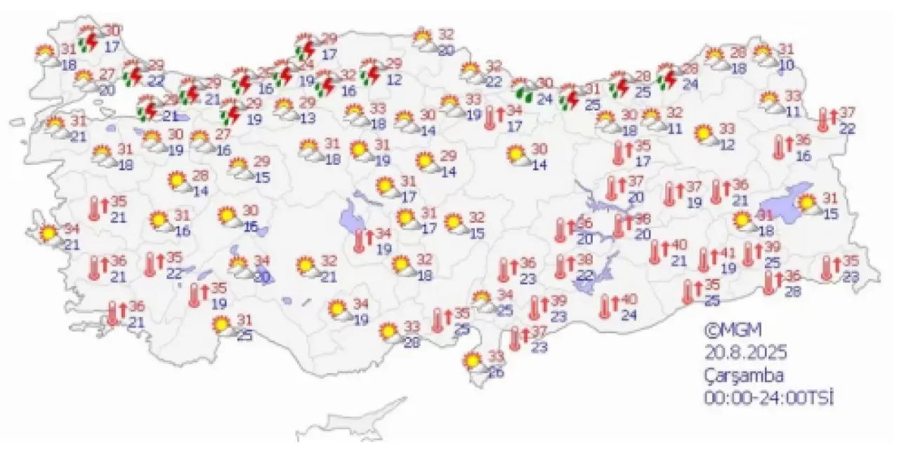 Meteoroloji Genel Müdürlüğü'nden alınan bilgilere göre İstanbul için 5 günlük hava durumu tahmini: Bugün için İstanbul hava durumu Kısa Süreli Gök Gürültülü Sağanak, sıcaklık 26°. Yarın için İstanbul hava durumu Az Bulutlu, sıcaklık 31°. 22 Ağustos 2025 Cuma İstanbul hava durumu Açık, Güneşli, sıcaklık 34°. 23 Ağustos 2025 Cumartesi İstanbul hava durumu Az Bulutlu, sıcaklık 31°. 24 Ağustos 2025 Pazar İstanbul hava durumu Gök Gürültülü Sağanak Yağış, sıcaklık 30°.