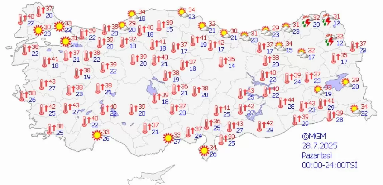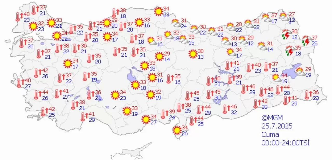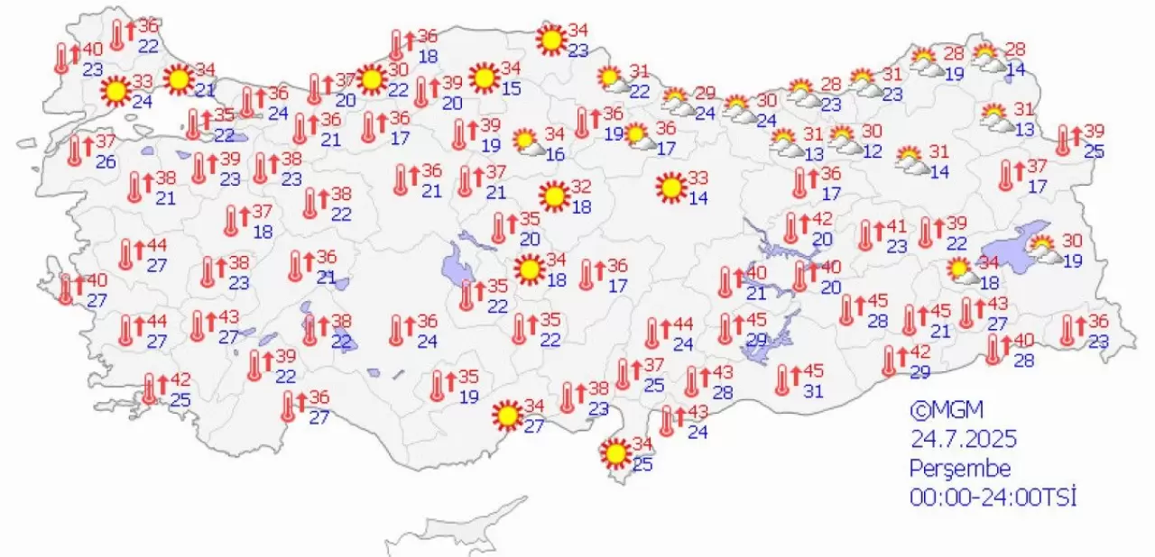 İstanbul'da perşembe günü için 34 derece sıcaklık beklentimiz var. İzmir'de 39 derece, Ankara'da ise 36 derece sıcaklık bekliyoruz. Perşembe günü için üç büyükşehrimizde kuzeyli yönlerden kuvvetli rüzgar beklentimiz var. Cuma günü için İstanbul'da 33 derece, Ankara'da 35 derece ve İzmir'de 40 derece sıcaklık beklentimiz var. Cumartesi günü İstanbul'da 33 derece, Ankara'da 33 derece ve İzmir'de 39 derece sıcaklık beklentimiz var.