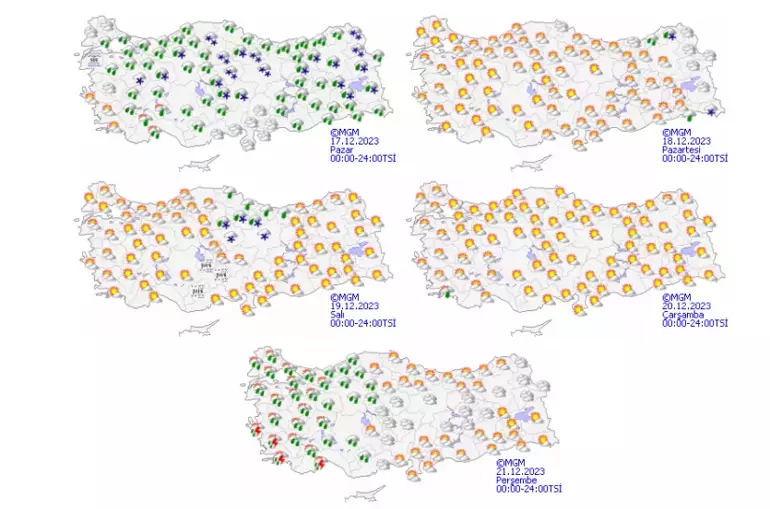 Meteoroloji Genel Müdürlüğü tarafından yapılan son değerlendirmelere göre: Ülkemizin geneli parcalı ve çok bulutlu, Doğu Akdeniz'in doğusu, Doğu Anadolu güneydoğusu ve Güney Doğu Anadolu'nun güney kesimleri haric yağışlı geçeceği tahmin ediliyor. Genellikle yağmur ve sağanak, Karadeniz'in iç kesimleri, Doğu Anadolu'nun doğusu, Edirne, Kırklareli, Bilecik, Kütahya, Eskişehir, Bursa'nın yüksekleri ile Ankara ve Sivas'ın kuzey ilçelerinde karla karışık yağmur ve kar şeklinde görülmesi beklenen yağışların; bu akşam ilk saatler Marmara, Kıyı Ege ve Antalya çevrelerinde kuvvetli, Antalya’nın doğu ilçelerinde çok kuvvetli, gece saatlerinden itibaren Doğu Karadeniz kıyılarında kuvvetli, Rize ve Artvin çevrelerinde çok kuvvetli yağmur, yükseklerinde yoğun kar olması bekleniyor. Gece ve sabah saatlerinde iç ve doğu kesimlerde yer yer pus ve sis bekleniyor.