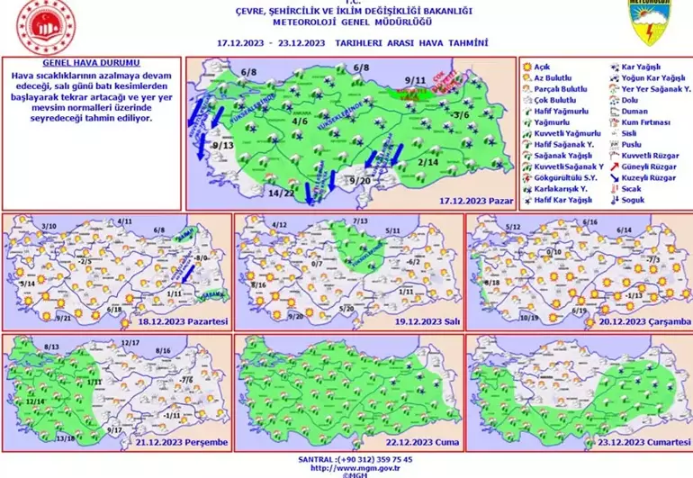 Meteoroloji tahminlerine göre; hava sıcaklıklarının azalmaya devam edeceği, Salı günü batı kesimlerden başlayarak tekrar artacağı ve yer yer mevsim normalleri üzerinde seyredeceği tahmin ediliyor.