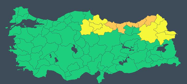 MGM tarafından Artvin, Giresun, Ordu, Rize ve Trabzon için turuncu kodlu kuvvetli yapış uyarısı yapılırken, Ağrı, Amasya, Çorum, Erzurum, Kars, Samsun, Tokat, Ardahan ve Iğdır illeri için sarı kodlu sağanak uyarısı yapıldı.