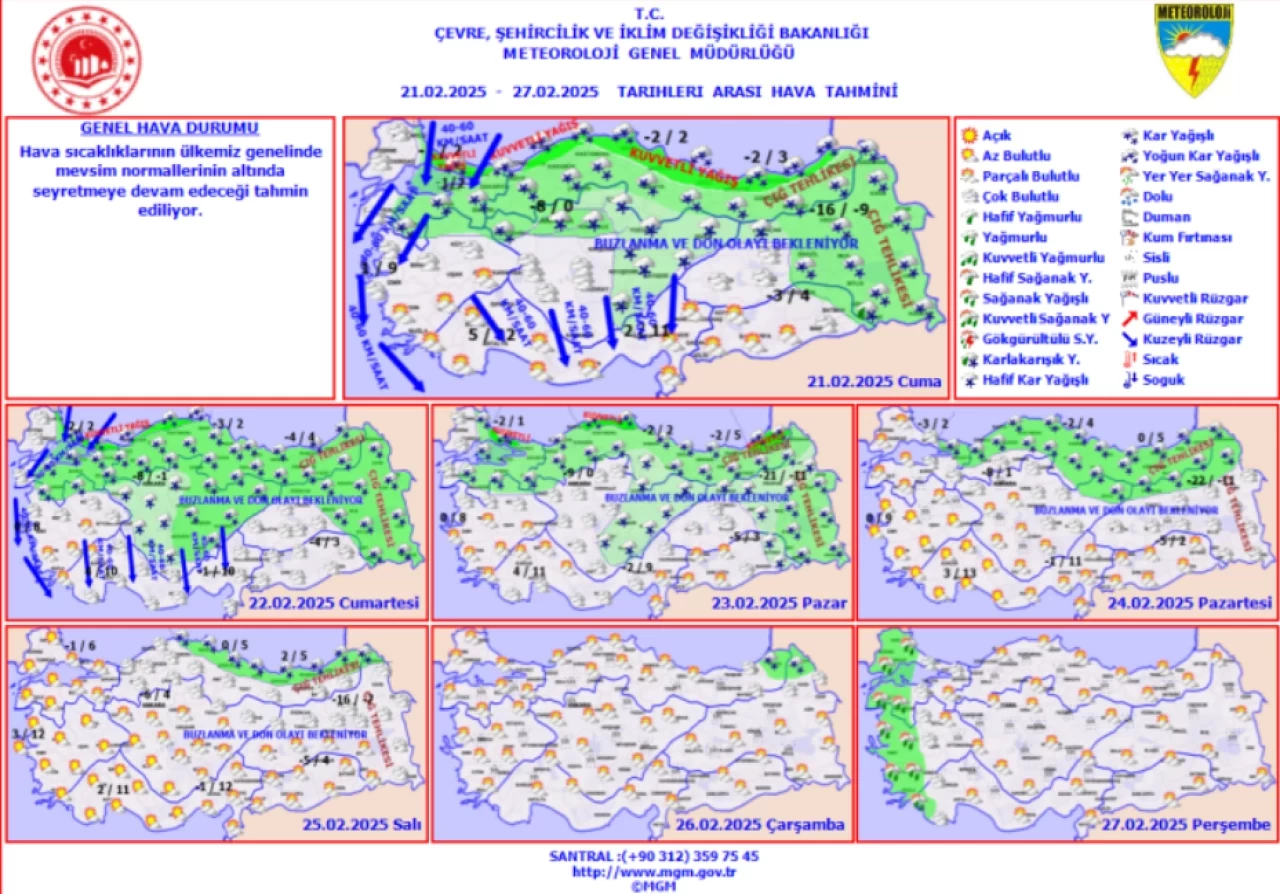 Son tahminlere göre, Orta ve Doğu Karadeniz kıyıları, Doğu ve Güneydoğu Anadolu bölgeleri ile İstanbul ve çevresinde kar yağışı devam edecek. Marmara, Kıyı Ege, Akdeniz’in iç kesimleri ile İç Anadolu’nun güneyinde saatte 60 km hıza ulaşabilecek fırtına bekleniyor.