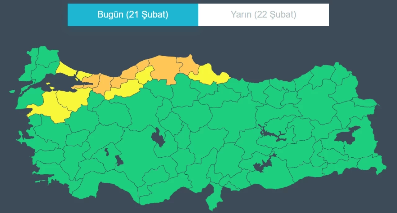 Sarı kod verilen iller arasında ise İstanbul bulunuyor. İstanbul, Balıkesir, Bolu, Bursa, Samsun ve Karabük.