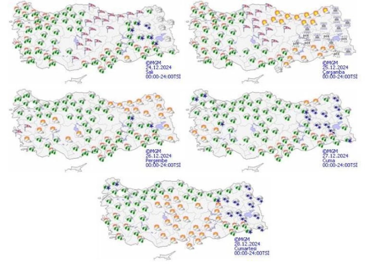 Yağışların; genellikle yağmur ve sağanak, Kıyılarda yer yer gök gürültülü sağanak, İç Anadolu’nun kuzeydoğusunun yüksekleri, Doğu Karadeniz’in iç kesimleri ile Doğu Anadolu'nun kuzey ve doğusunda karla karışık yağmur ve kar şeklinde olması bekleniyor. Yağışların; Marmara'nın batısı, Kıyı Ege, Doğu Akdeniz, Antalya’nın doğusu ile Gaziantep, Kilis ve Adıyaman çevrelerinde yerel kuvvetli olması bekleniyor.
