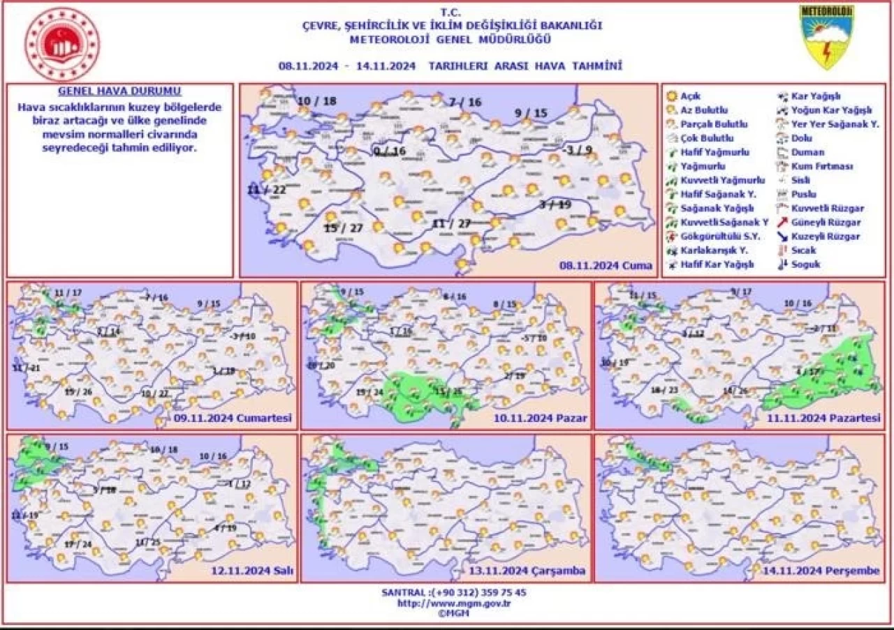 Meteoroloji Genel Müdürlüğü tarafından yapılan son tahminlere göre: Ülkemiz genelinde yağış beklenmiyor. Yurdun kuzey kesimlerinin parçalı bulutlu, diğer yerlerin az bulutlu ve açık geçeceği tahmin ediliyor. Sabah ve gece saatlerinde kuzey ve iç kesimlerde yer yer pus ve sis bekleniyor.