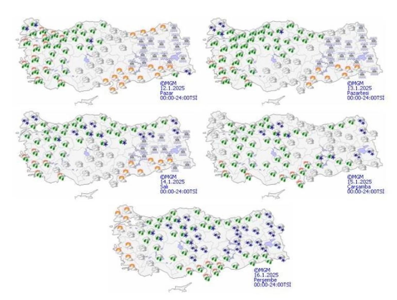 Meteoroloji Genel Müdürlüğü tarafından yapılan son tahminlere göre: Ülkemiz genelinin parçalı yer yer çok bulutlu, Marmara, Ege ve Batı Karadeniz ile Akdeniz'in batı, İç Anadolu'nun kuzeybatı kesimleri ve Hakkari çevrelerinin yağışlı geçeceği; Trakya'nın kuzey, Marmara'nın güney ve batı, Antalya'nın doğu kesimleri ile Ege kıyılarında yer yer kuvvetli olması beklenen yağışların genellikle yağmur ve sağanak, Trakya'nın iç kesimlerinde karla karışık yağmur ve yer yer kar, Hakkari çevrelerinde hafif kar şeklinde görüleceği tahmin ediliyor. Ülkemizin iç ve doğu kesimlerinde buzlanma ve don ile birlikte pus ve yer yer sis görülmesi bekleniyor. Doğu Karadeniz’in iç kesimlerinin yüksekleri ile Doğu Anadolu’nun yüksek ve dik yamaçlarında çığ tehlikesi bulunmaktadır.