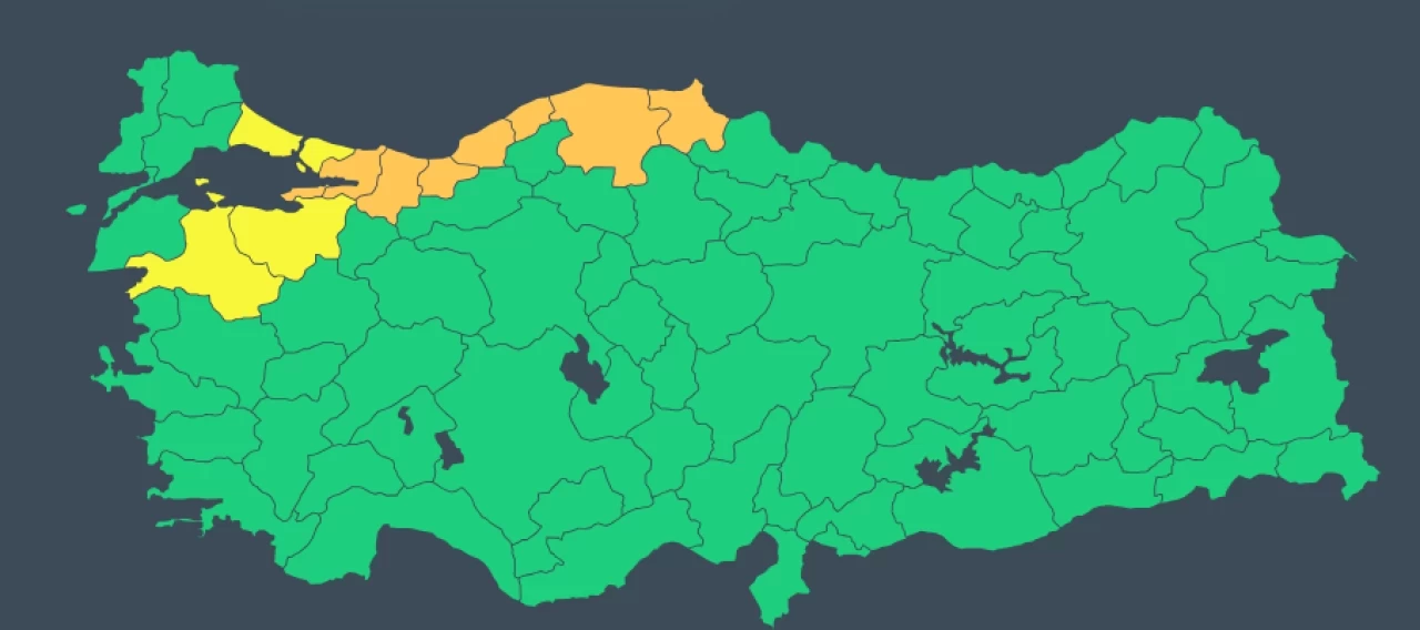 - Turuncu kodlu uyarı: Kastamonu, Kocaeli, Sakarya, Sinop, Zonguldak, Bartın, Yalova ve Düzce.