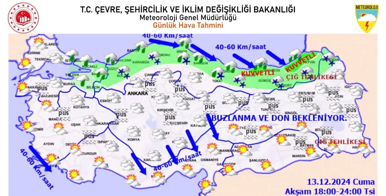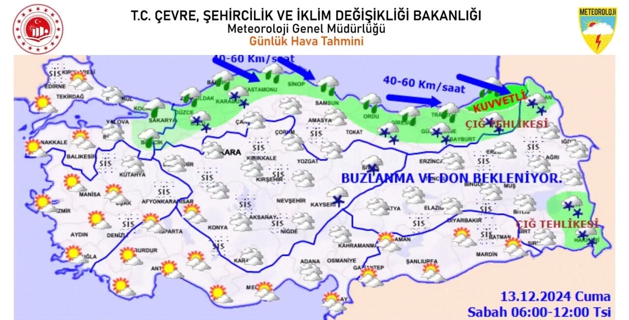 Meteoroloji Genel Müdürlüğü, Cuma günü için sabahın ilk saatlerinde yurt geneli için kritik uyarılarda bulundu. Özellikle ülkenin kuzeyinde donma riskinin arttığı ve hava sıcaklığının mevsim normallerinin 1 ila 3 derece altında olacağı belirtildi.
