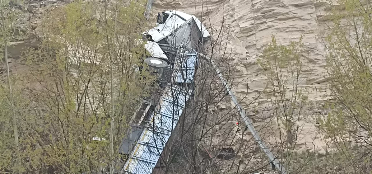 Sivas'ta metrelerce yükseklikten uçuruma düşen tırın sürücüsü kazayı hafif sıyrıklarla atlattı.