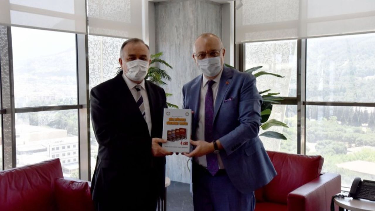 Ziyaretten duyduğu memnuniyeti ifade eden Başkan Cengiz Ergün, MHP Grup Başkanvekili Erkan Akçay’a 38 akademisyen tarafından hazırlanan ve Manisa’nın geçmişine ışık tutan ‘Yüzüncü Yılında Milli Mücadele Döneminde Manisa’ isimli 4 ciltlik kitap serisini armağan etti.