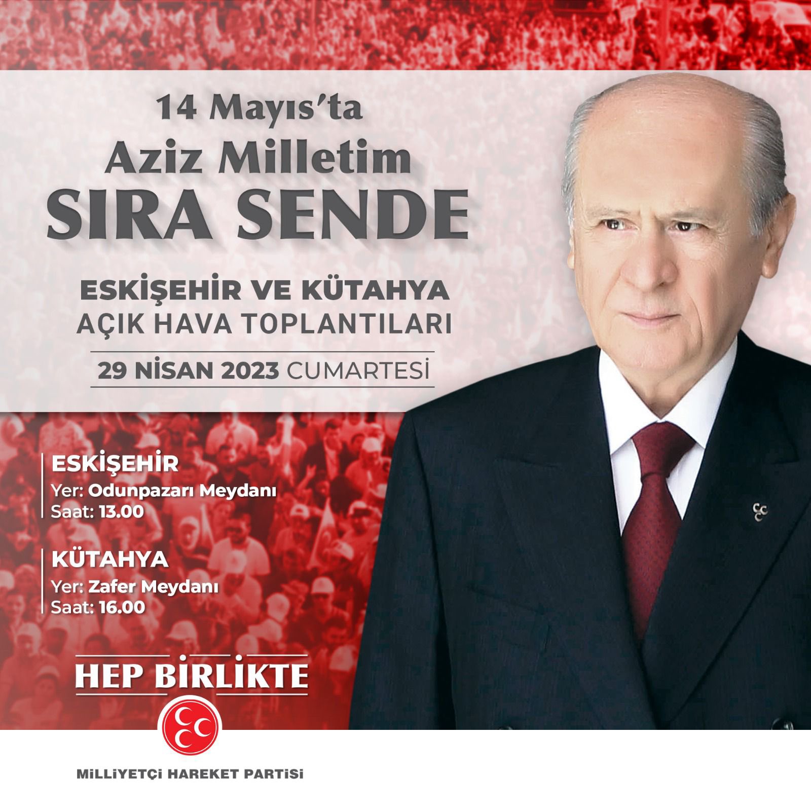 Milliyetçi Hareket Partisi (MHP), 29 Nisan Cumartesi günü MHP Genel Başkanı Devlet Bahçeli’nin katılımıyla Eskişehir ve Kütahya’da “14 Mayıs’ta Aziz Milletim Sıra Sende” temalı açık hava toplantı programı düzenleneceğini duyurdu.
