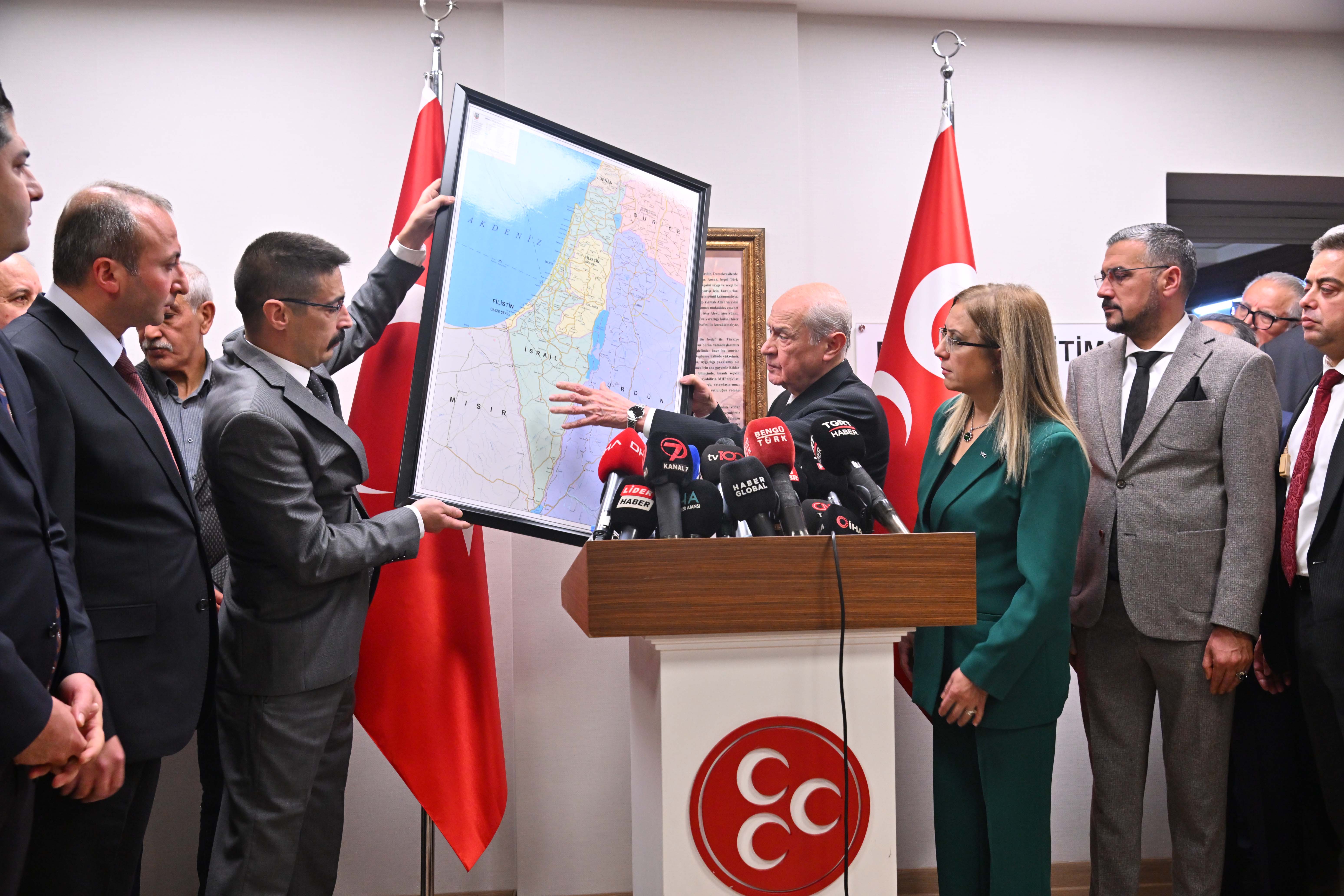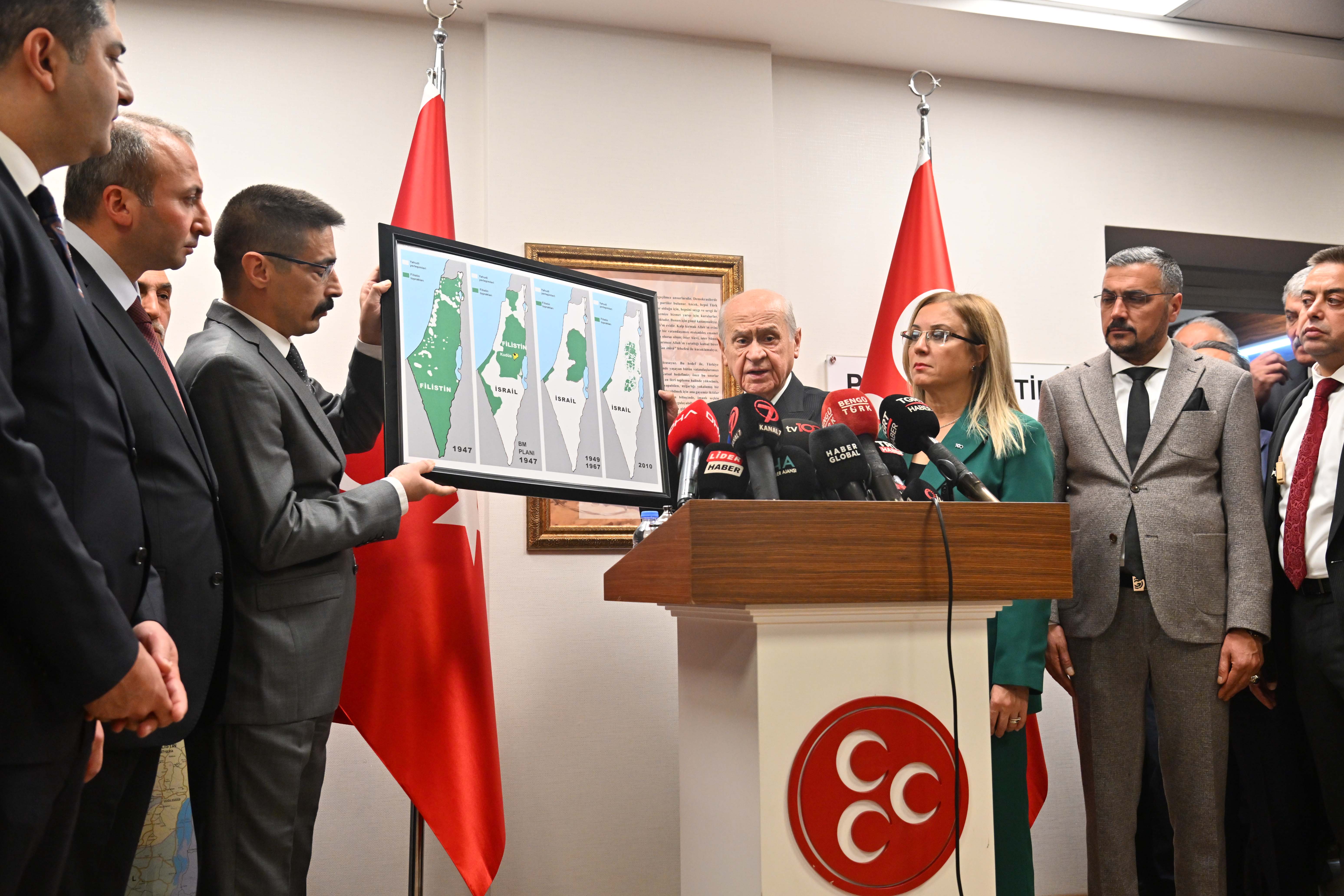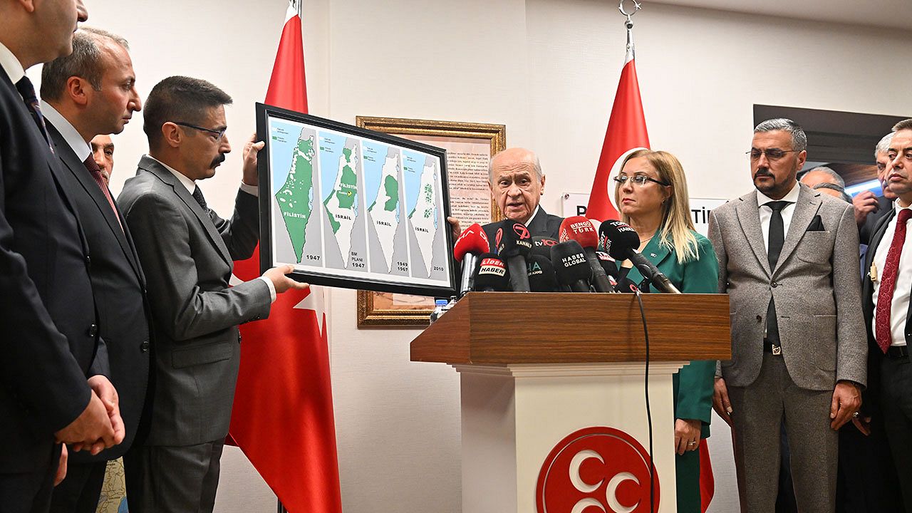 1947 yılındaki Filistin, şurası 1967 arasındaki gelişmeler, 2010 yılındaki gelişmeler... Filistin toplumu yok ediliyor. 1967 hesap alınarak başkenti Kudüs olan Filistin devleti kurulmalı. Orada çocuklarımızın defni dahi yapılamıyor. MHP olarak bu bölgede barışın huzurun istikrarın sağlanabilmesi için bir barış çemberinin oluşması lazım.