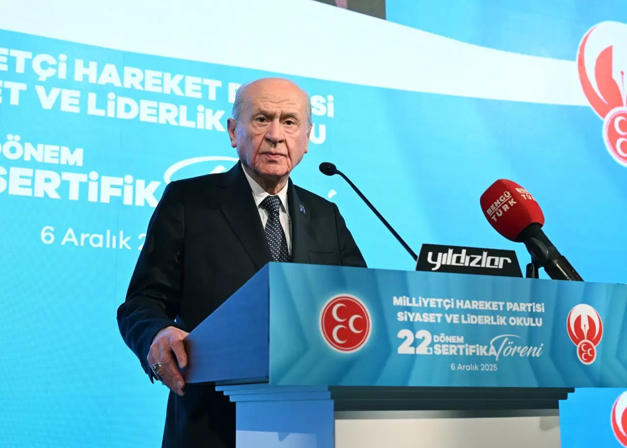 MHP Lideri Devlet Bahçeli, partisinin Siyaset ve Liderlik Okulu 22. Dönem Sertifika Töreni'nde açıklamalarda bulundu. Lider Bahçeli, "Bazı provakatif çıkışlara, siyonist-emperyalist telkinlere, abuk sabuk ifadelere, tahrik ortamını canlandırmaya dayalı küstah söylemlere rağmen Terörsüz Türkiye hedefinde aşama aşama kademe kademe sonuca doğru gidiyoruz" dedi.