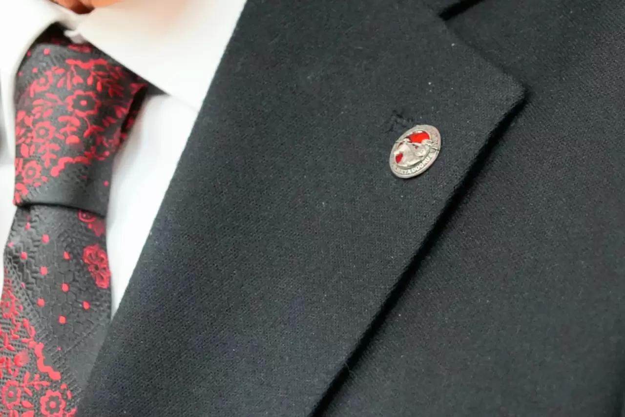 Lider Devlet Bahçeli’nin yakasında taşıdığı rozette de yine saldırı pozisyonunda mızraklı Türk süvarisi figürü ve “Kızıl Elmaya Doğru” yazısı yer aldı.