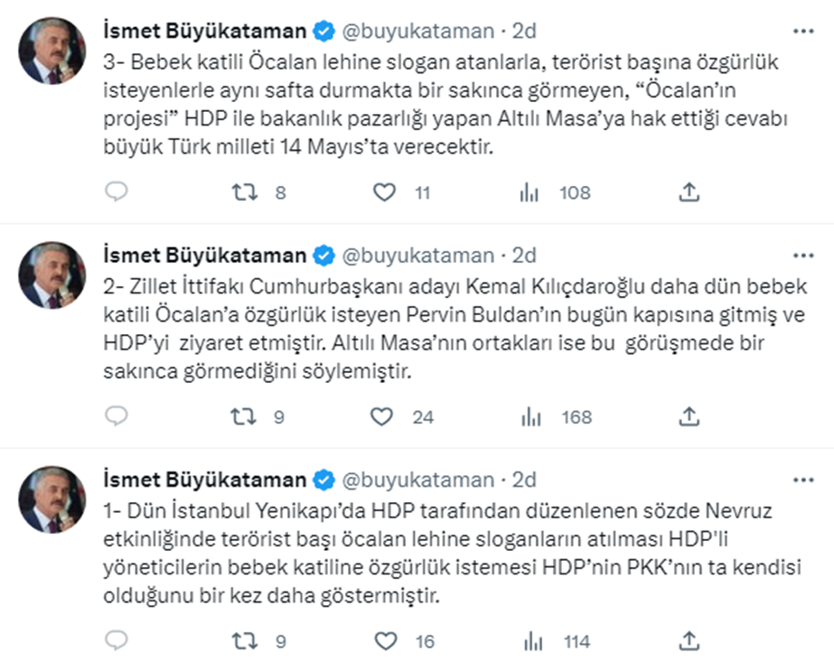 Bebek katili Öcalan lehine slogan atanlarla, terörist başına özgürlük isteyenlerle aynı safta durmakta bir sakınca görmeyen, “Öcalan’ın projesi” HDP ile bakanlık pazarlığı yapan Altılı Masa’ya hak ettiği cevabı büyük Türk milleti 14 Mayıs’ta verecektir.”