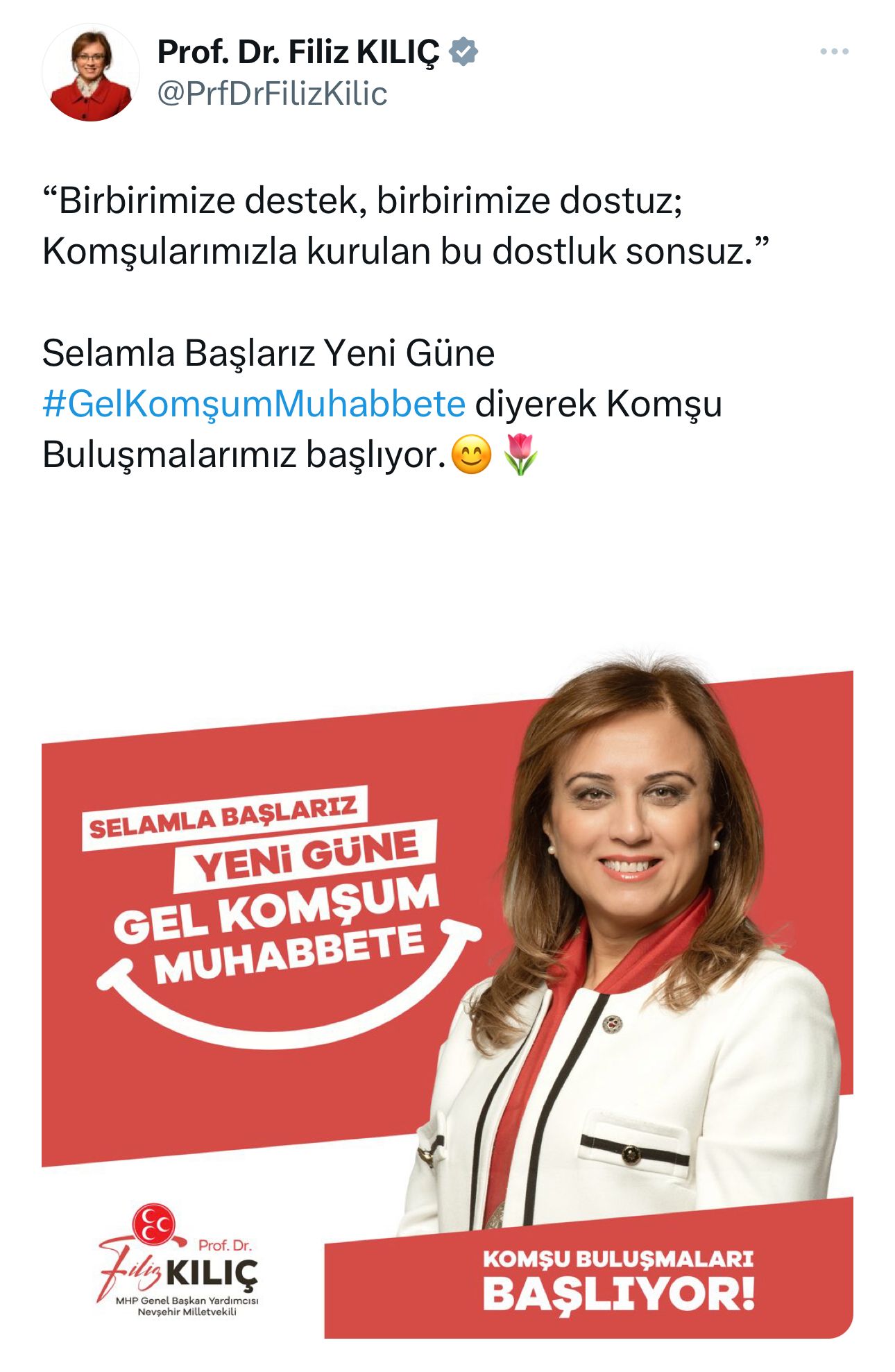 MHP Genel Başkan Yardımcısı ve Nevşehir Milletvekili Prof. Dr. Filiz Kılıç, Türkiye ve dünyada yaşanan gelişmelere ilişkin toplumsal farkındalığı güçlendirmek, Cumhur İttifakı’nın hedeflerini ve muhalefetin durumunu vatandaşlara yakından paylaşmak amacıyla yeni bir faaliyet programı uygulanmasının kararlaştırıldığını ifade ederek, şunları kaydetti: